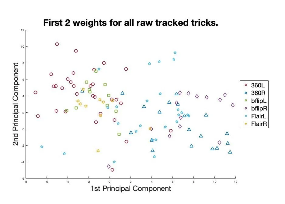 Eva then used singular value decomposition (SVD) to calculate the common basis functions of the tracking data [3]. She used the weights of these basis functions as a unique set of principal components to describe each individual trick. Figure 2 shows the first two principal components of backflips, flairs, and 360s, in the left and right direction. The clustering around trick types shows that these metrics are useful to differentiate between trick types.